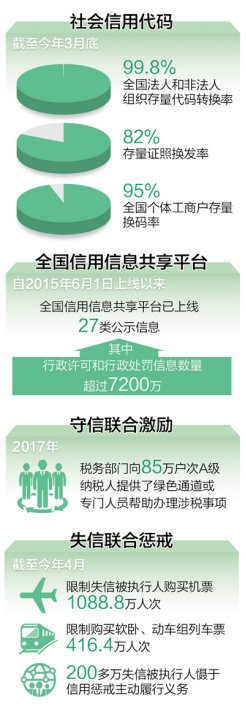 截至目前,国家发改委联合有关部门已签署联合奖惩合作备忘录36个,制定联合奖惩措施100多项,初步建立起“发起—响应—反馈”机制。比如在守信联合激励方面,2017年,税务部门向85万户次A级纳税人提供了绿色通道或专门人员帮助办理涉税事项;在失信联合惩戒方面,截至2018年4月,限制失信被执行人购买机票1088.8万人次,限制购买软卧、动车组列车票416.4万人次,200多万失信被执行人慑于信用惩戒主动履行义务。