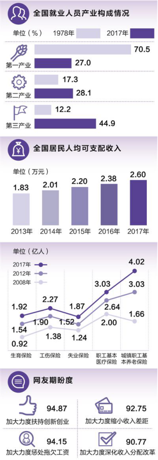 2017年末全国就业人员达7.76亿人,比1978年增加3.75亿人。不仅仅是数量上的变化,随着我国经济结构的持续优化,就业结构逐步改善,就业的渠道越来越宽了。