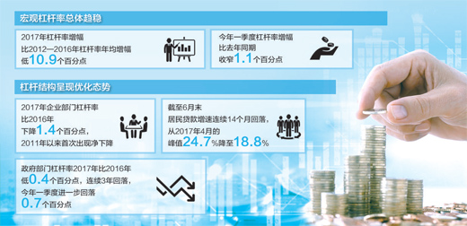 数据显示,去年以来,我国宏观杠杆率上升势头明显放缓。2017年杠杆率增幅比2012—2016年杠杆率年均增幅低10.9个百分点,今年一季度杠杆率增幅比去年同期收窄1.1个百分点。宏观杠杆率总体趋稳,杠杆结构也呈现优化态势。