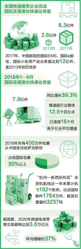 “这是一个买全球、卖全球的时代,中国的物流企业就该为这样的时代服务。”菜鸟总裁万霖说。根据国家邮政局的数据显示,2017年,全国快递服务企业完成国际及港澳台快递业务量8.3亿件,是2013年的3.2倍。今年1—9月,国际及港澳台快递业务量为7.9亿件,同比增长39.3%,增速超行业整体增速12.5个百分点,已连续16个月高于行业整体增速,成为我国快递业务增长亮点。