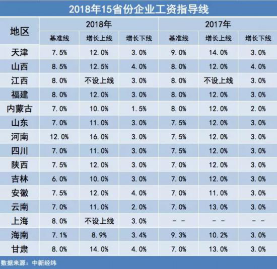 据不完全统计,截至21日,至少已有甘肃、海南、天津、山西、江西、福建、内蒙古、山东、河南、四川、陕西、吉林、安徽、云南、上海等15个省份公布了2018年企业工资指导线。