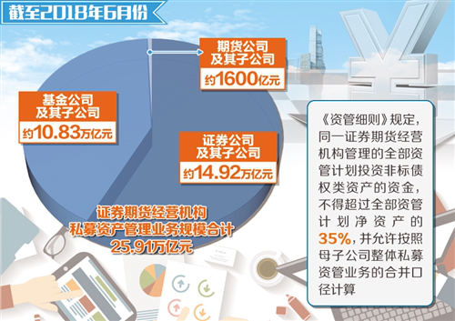 截至2018年6月份,证券期货经营机构私募资产管理业务规模合计25.91万亿元,其中证券公司及其子公司约14.92万亿元,基金公司及其子公司约10.83万亿元,期货公司及其子公司约1600亿元。这意味着该《资管细则》将对近26万亿元的资金市场产生影响。