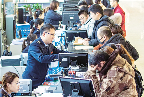12月20日,在位于武邑县政务服务中心的武邑县税务局办税大厅内,工作人员在为客户办理纳税业务。 2018年,河北省武邑县税务局积极推行“套餐式”服务,进一步压缩流程,优化营商环境。新华社记者 李晓果 摄