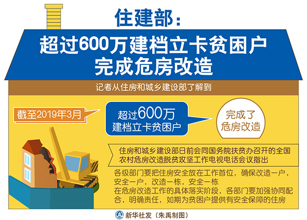 新华社北京3月7日电(薛宇航、王优玲)记者从住房和城乡建设部了解到,近年来农村危房改造工作取得了实质性进展,截至2019年3月,超过600万建档立卡贫困户完成了危房改造。