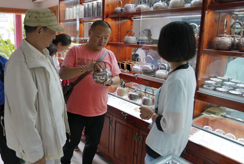 游客在李德昌家开设的乡村旅游店里挑选银器制品(8月10日摄)。新华社记者 秦晴 摄