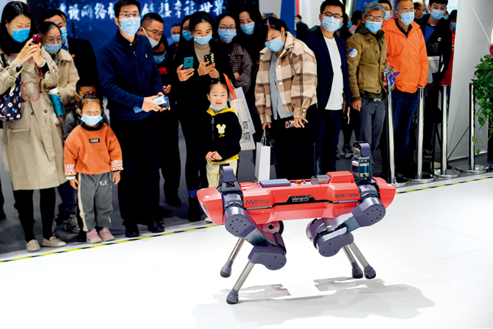 11月22日,观众在2020年世界互联网大会“互联网之光”博览会上观看四足机器人 黄宗治摄/新华网