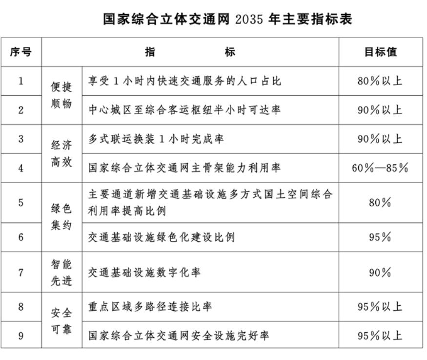 到2035年,基本建成便捷顺畅、经济高效、绿色集约、智能先进、安全可靠的现代化高质量国家综合立体交通网,实现国际国内互联互通、全国主要城市立体畅达、县级节点有效覆盖,有力支撑“全国123出行交通圈”(都市区1小时通勤、城市群2小时通达、全国主要城市3小时覆盖)和“全球123快货物流圈”(国内1天送达、周边国家2天送达、全球主要城市3天送达)。交通基础设施质量、智能化与绿色化水平居世界前列。交通运输全面适应人民日益增长的美好生活需要,有力保障国家安全,支撑我国基本实现社会主义现代化。
