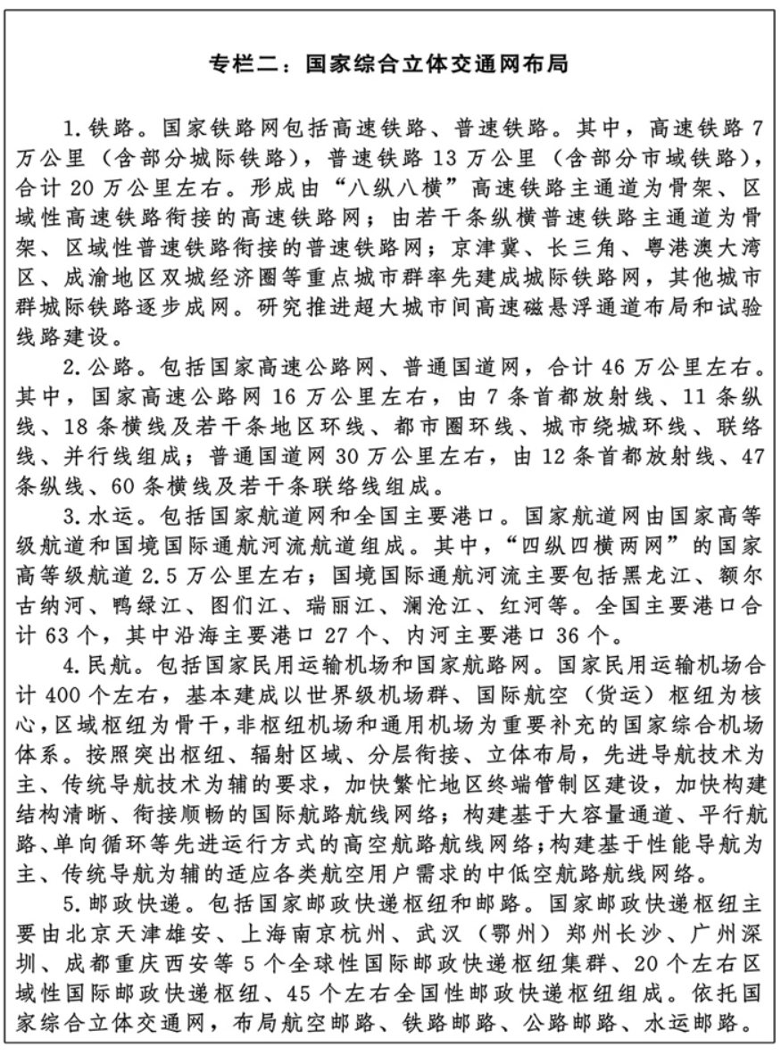 到2035年,国家综合立体交通网实体线网总规模合计70万公里左右(不含国际陆路通道境外段、空中及海上航路、邮路里程)。其中铁路20万公里左右,公路46万公里左右,高等级航道2.5万公里左右。沿海主要港口27个,内河主要港口36个,民用运输机场400个左右,邮政快递枢纽80个左右。