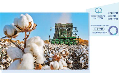 中国棉花协会的数据显示,2020年中国棉花产量592.37万吨,进口235万吨,出口3万吨,消费810万吨。近年来,新疆棉花种植面积持续增加,已成为中国棉花最重要的产地。2020年新疆棉花产量达到516.1万吨,占全国棉花产量的87%。