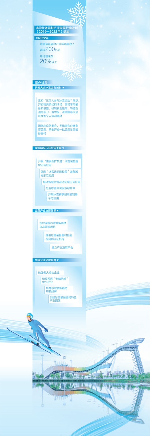 中国冰雪运动正迎来前所未有的发展机遇,“带动三亿人参与冰雪运动”向纵深推进,冰雪装备器材产业无疑搭上了这趟快速前行的列车。工业和信息化部、教育部、国家体育总局等9部门联合印发《冰雪装备器材产业发展行动计划(2019—2022年)》,提出“到2022年,冰雪装备器材产业年销售收入超过200亿元,年均增速在20%以上。”