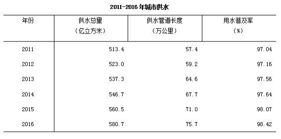 2016年年末,城市供水综合生产能力达到3.03亿立方米/日,比上年增长2.2%,其中,公共供水能力2.39亿立方米/日,比上年增长3.4%。供水管道长度75.7万公里,比上年增长6.5%。2016年,年供水总量580.7亿立方米,其中,生产运营用水160.7亿立方米,公共服务用水81.6亿立方米,居民家庭用水220.5亿立方米。用水人口4.70亿人,人均日生活用水量176.9升,用水普及率98.42%[6],比上年增加0.35个百分点。2016年,城市节约用水57.6亿立方米,节水措施总投资29.5亿元。