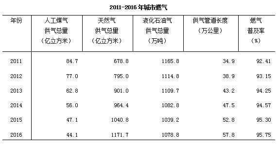 2016年,人工煤气供气总量44.1亿立方米,天然气供气总量1171.7亿立方米,液化石油气供气总量1078.8万吨,分别比上年减少6.5%、增长12.6%、增长3.8%。人工煤气供气管道长度1.9万公里,天然气供气管道长度55.1万公里,液化石油气供气管道长度0.9万公里,分别比上年减少13.0%、增长10.6%、减少3.3%。用气人口4.57亿人,燃气普及率95.75%,比上年增加0.45个百分点。