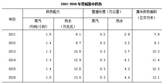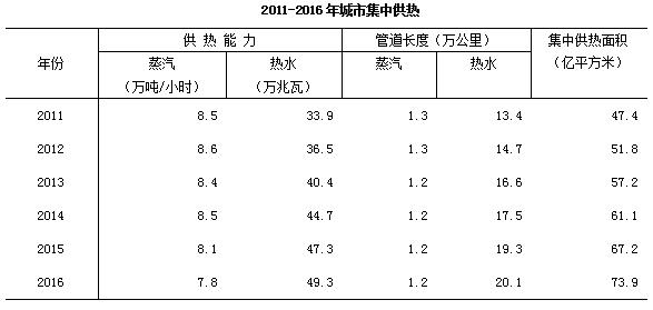 2016年年末,城市供热能力(蒸汽)7.8万吨/小时,比上年减少3.0%,供热能力(热水)49.3万兆瓦,比上年增长4.4%,供热管道21.4万公里,比上年增长4.5%,集中供热面积73.9亿平方米,比上年增长9.9%。