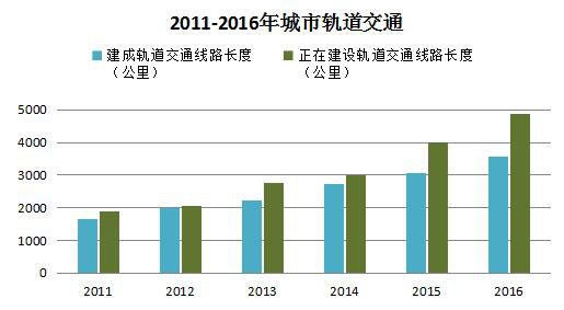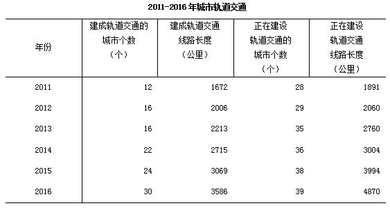 2016年年末,全国有30[7]个城市建成轨道交通,线路长度3586公里,分别比上年增加6个城市,增长16.8%,车站数2383个,其中换乘站541个,配置车辆数19284辆。全国39个[7]城市在建轨道交通,线路长度4870公里,分别比上年增加1个城市,增长21.9%,车站数3080个,其中换乘站827个。