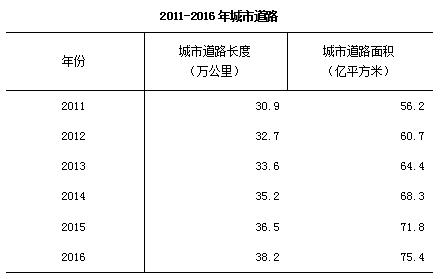 2016年年末,城市道路长度38.2万公里,比上年增长4.8%,道路面积75.4亿平方米,比上年增长5.0%,其中人行道面积16.9亿平方米。人均城市道路面积15.8平方米,比上年增加0.2平方米。2016年,全国城市新建地下综合管廊1791公里,形成廊体479公里。