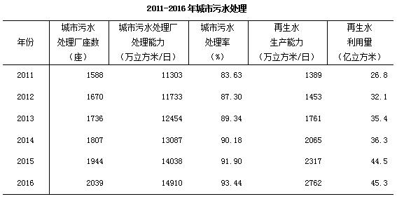 2016年年末,全国城市共有污水处理厂2039座,比上年增加95座,污水厂日处理能力14910万立方米,比上年增长6.2%,排水管道长度57.7万公里,比上年增长6.9%。城市年污水处理总量448.8亿立方米,城市污水处理率93.44%,比上年增加1.54个百分点,其中污水处理厂集中处理率89.80%,比上年增加1.83个百分点。城市再生水日生产能力2762万立方米,再生水利用量45.3亿立方米。