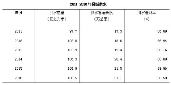 2016年年末,县城供水综合生产能力达到0.54亿立方米/日,比上年减少6.0%,其中,公共供水能力0.46亿立方米/日,比上年减少3.3%。供水管道长度21.1万公里,比上年减少1.6%。2016年,全年供水总量106.5亿立方米,其中生产运营用水27.0亿立方米,公共服务用水11.6亿立方米,居民家庭用水48.9亿立方米。用水人口1.40亿人,用水普及率90.5%,比上年增加0.54个百分点,人均日生活用水量119.43升。2016年,县城节约用水2.3亿立方米,节水措施总投资2.98亿元。