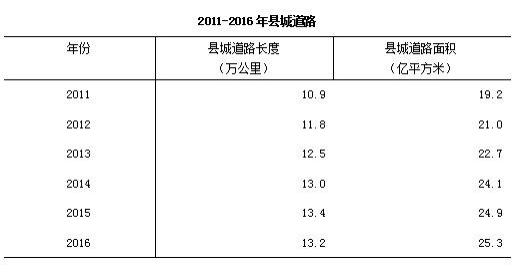 2016年年末,县城道路长度13.2万公里,比上年减少1.4%,道路面积25.3亿平方米,比上年增长1.6%,其中人行道面积6.3亿平方米,人均城市道路面积16.41平方米,比上年增加0.43平方米。2016年,全国县城新建地下综合管廊214公里,形成廊体59公里。