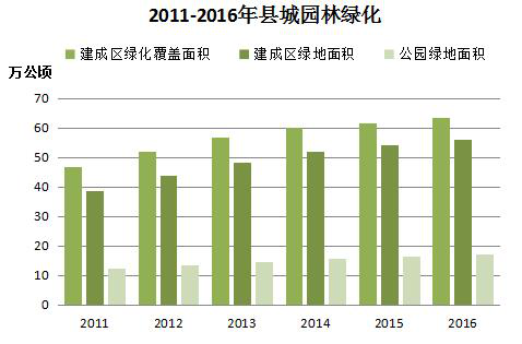 2016年年末,县城建成区绿化覆盖面积63.3万公顷,比上年增长2.6%,建成区绿化覆盖率32.53%,比上年增加1.75个百分点;建成区绿地面积55.9万公顷,比上年增长3.2%,建成区绿地率28.74%,比上年增加1.69个百分点;公园绿地面积17.1万公顷,比上年增长4.4%,人均公园绿地面积11.05平方米,比上年增加0.58平方米。