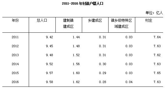 2016年年末,全国共有建制镇20883个,乡(苏木、民族乡、民族苏木)10872个。据对18099个建制镇、10883个乡(苏木、民族乡、民族苏木)、775个镇乡级特殊区域和261.7万个自然村(其中村民委员会所在地52.6万个)统计汇总[9],村镇户籍总人口9.58亿。其中,建制镇建成区1.62亿,占村镇总人口的16.96%;乡建成区0.28亿,占村镇总人口的2.92%;镇乡级特殊区域建成区0.04亿,占村镇总人口的0.45%;村庄7.63亿,占村镇总人口的79.67%。