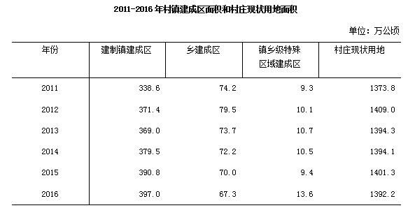 2016年年末,全国建制镇建成区面积397.0万公顷,平均每个建制镇建成区占地219公顷,人口密度4902人/平方公里(含暂住人口);乡建成区67.3万公顷,平均每个乡建成区占地62公顷,人口密度4450人/平方公里(含暂住人口);镇乡级特殊区域建成区13.6万公顷,平均每个镇乡级特殊区域建成区占地176公顷,人口密度3665人/平方公里(含暂住人口)。