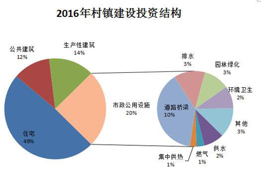 2016年,全国村镇建设总投资15908亿元。按地域分,建制镇建成区6825亿元,乡建成区524亿元,镇乡级特殊区域建成区238亿元,村庄8321亿元,分别占总投资的42.9%、3.3%、1.5%、52.3%。按用途分,房屋建设投资11882亿元,市政公用设施建设投资4026亿元,分别占总投资的74.7%、25.3%。