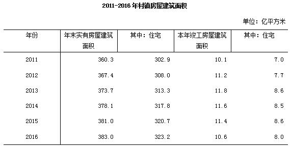 2016年,全国村镇房屋竣工建筑面积10.6亿平方米,其中住宅8.0亿平方米,公共建筑1.1亿平方米,生产性建筑1.5亿平方米。2016年年末,全国村镇实有房屋建筑面积383.0亿平方米,其中住宅323.2亿平方米,公共建筑24.0亿平方米,生产性建筑35.8亿平方米,分别占84.4%、6.3%、9.3%。