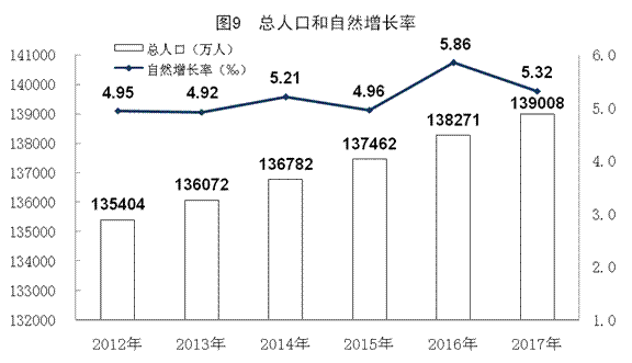 年末中国大陆总人口(包括31个省、自治区、直辖市和中国人民解放军现役军人,不包括香港、澳门特别行政区和台湾省以及海外华侨人数)139008万人,比上年末增加737万人。全年出生人口1723万人,人口出生率为12.43‰;死亡人口986万人,人口死亡率为7.11‰;人口自然增长率为5.32‰。从性别结构看,男性人口71137万人,女性人口67871万人,总人口性别比为104.81(以女性为100)。从年龄构成看,16至59周岁的劳动年龄人口为90199万人,占总人口的比重为64.9%;60周岁及以上人口24090万人,占总人口的17.3%,其中65周岁及以上人口15831万人,占总人口的11.4%。从城乡结构看,城镇常住人口81347万人,比上年末增加2049万人;乡村常住人口57661万人,减少1312万人;城镇人口占总人口比重(城镇化率)为58.52%,比上年末提高1.17个百分点。全国人户分离人口(即居住地和户口登记地不在同一个乡镇街道且离开户口登记地半年以上的人口)2.91亿人,比上年末减少98万人;其中流动人口2.44亿人,比上年末减少82万人。年末全国就业人员77640万人,其中城镇就业人员42462万人。