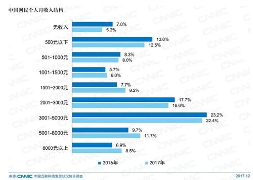 报告显示,2017年,中国网民结构规模向高收入群体扩散,月收入在5000元以上的群体占比较2016年增长3.7个百分点。无收入的网民占比进一步缩小,从2016年的7%减少为5.2%。