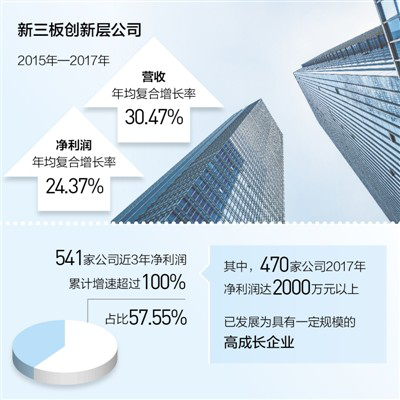 被称为“跑在互联网上的售货机”的友宝在线,2015年扭亏为盈后,2016年和2017年继续保持了2.46倍和42.91%的增长;英雄互娱近3年复合增长率达738倍,2017年净利润达8.90亿元……全国股转公司近日发布的数据显示,创新层公司近3年实现跨越式增长,2015—2017年三年营收和净利润年均复合增长率分别达30.47%和24.37%,较创业板公司分别高1.45个和13.37个百分点。541家公司近3年净利润累计增速超过100%,占比57.55%,其中有470家公司2017年净利润达2000万元以上,已发展为具有一定规模的高成长企业。