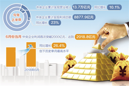 “今年6月份,中央企业利润首次突破2000亿元,达到2018.8亿元,同比增长26.4%,创历史单月最高水平。单月利润和半年利润均创历史纪录。”彭华岗说。