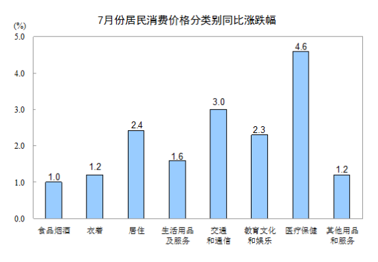 其他七大类价格同比均上涨。其中,医疗保健、交通和通信、居住价格上涨率排前三,分别上涨4.6%、3.0%和2.4%。