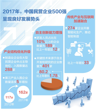 此外,随着“互联网+”的不断深入,传统产业与互联网加速融合。2017年民营企业500强中,有453家企业结合自身产业特点与互联网开展创新,其中274家开展智能化生产,推动智能制造,比2016年增加33家,占60.49%。