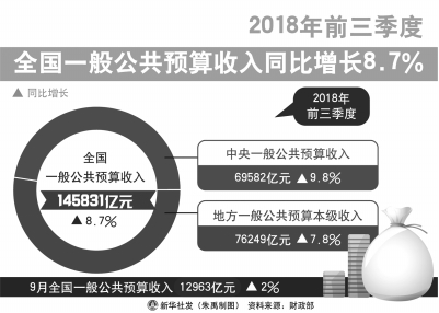 财政部10月18日发布的前三季度财政收支情况显示,今年1—9月份,全国一般公共预算收入145831亿元,同比增长8.7%;全国一般公共预算支出163289亿元,同比增长7.5%。今年前三季度,我国财政收入运行有哪些突出特点?减税降费落实成效如何?积极财政政策怎样更加精准?财政部相关负责人进行了全面详解。