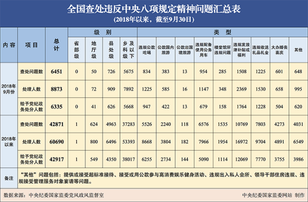北京10月23日电 据中央纪委国家监委网站消息,为掌握全国贯彻落实中央八项规定精神情况,中央纪委在各省区市和新疆生产建设兵团、各中央和国家机关、各中央企业和中央金融企业等建立了落实中央八项规定精神情况月报制度。2018年以来,截至9月30日,全国查处违反中央八项规定精神问题情况如下: