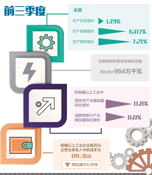 今年以来,钢铁行业按照相关工作部署,严禁新增钢铁产能,并开展化解钢铁过剩产能督查,防范“地条钢”死灰复燃及已化解的过剩产能复产。今年前三季度,全国生产生铁、粗钢和钢材同比分别增长1.19%、6.07%和7.21%。其中,粗钢产量增长补充了“地条钢”退出市场空间,是优质产能取代落后产能的增长。