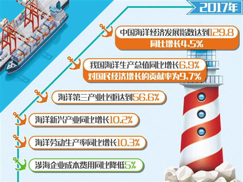 2018中国海洋经济发展指数显示,2010年至2017年,中国海洋经济发展指数年均增速3.8%,2017年达到129.8,比上年增长4.5%,总体表现稳中向好。其中,发展水平指数为127.4,发展成效指数为123.3,发展潜力指数为139.6,分别比上年增长5.6%、1.8%、5.4%。2017年,我国海洋生产总值比上年增长6.9%,对国民经济增长的贡献率为9.7%;服务业在海洋经济发展中的主体作用不断增强,海洋第三产业比重达到56.6%;海洋新兴产业继续保持快速发展势头,比上年增长10.2%;海洋劳动生产率平稳提高,比上年增长10.3%;涉海企业生产效益明显提升,成本费用比上年降低5%,主营业务利润率、资产利润率止跌回升,分别比上年增长2.1个和1.3个百分点;与海上丝绸之路沿线国家贸易额超1万亿美元,比上年增长14.8%。