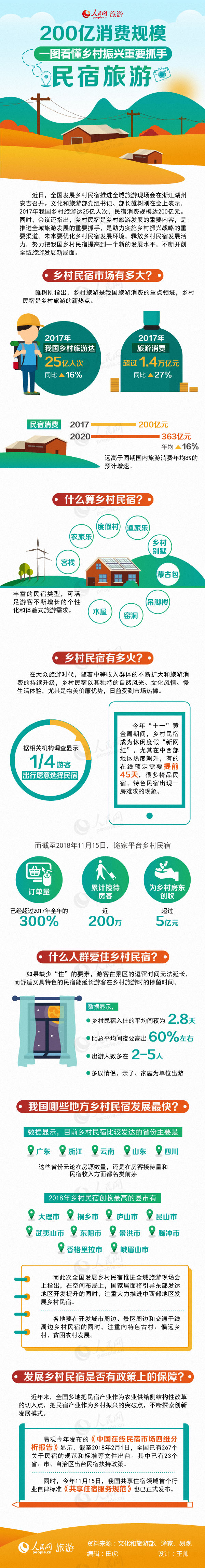近日,全国发展乡村民宿推进全域旅游现场会在浙江湖州安吉召开。文化和旅游部党组书记、部长雒树刚在会上表示,2017年我国乡村旅游达25亿人次,民宿消费规模达200亿元。同时,会议还指出,乡村民宿是乡村旅游发展的重要内容,是助力实施乡村振兴战略的重要渠道,未来要优化乡村民宿发展环境,不断开创全域旅游发展新局面。如此大的规模,乡村民宿到底是什么?哪些地区乡村民宿最火?什么人群愿为乡村民宿买单?一张图带你读懂乡村民宿!