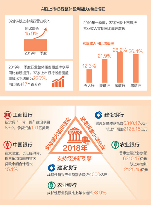 近日,A股上市银行集中公布了今年一季度季报。季报显示,32家上市银行整体盈利能力持续增强,营业收入同比增长15.9%,高于2018年度增速7.5个百分点,资产质量持续改善。同时,越来越多的银行信贷资金流向民营企业和小微企业,滋养实体经济。