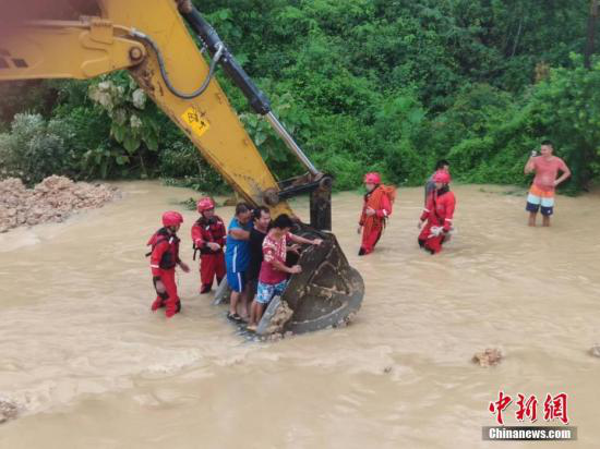 6月16日,因遭遇暴雨袭击,广西沿海多处发生严重内涝,居民被困。当地消防部门接到求助信息后,先后转移被困的居民数十人。中新社发 骆应铭 摄