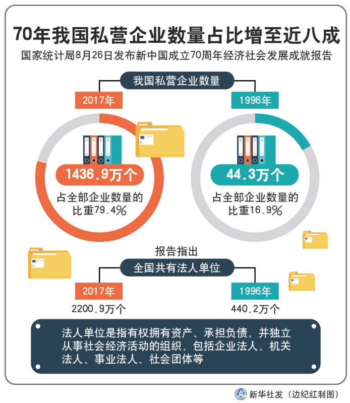 国家统计局26日发布新中国成立70周年经济社会发展成就报告。报告显示,新中国成立以来,我国法人单位数量快速增长,市场活力不断激发。特别是改革开放以来,私营企业数量显著增长,2017年达1436.9万个,占全部企业数量的比重达79.4%。