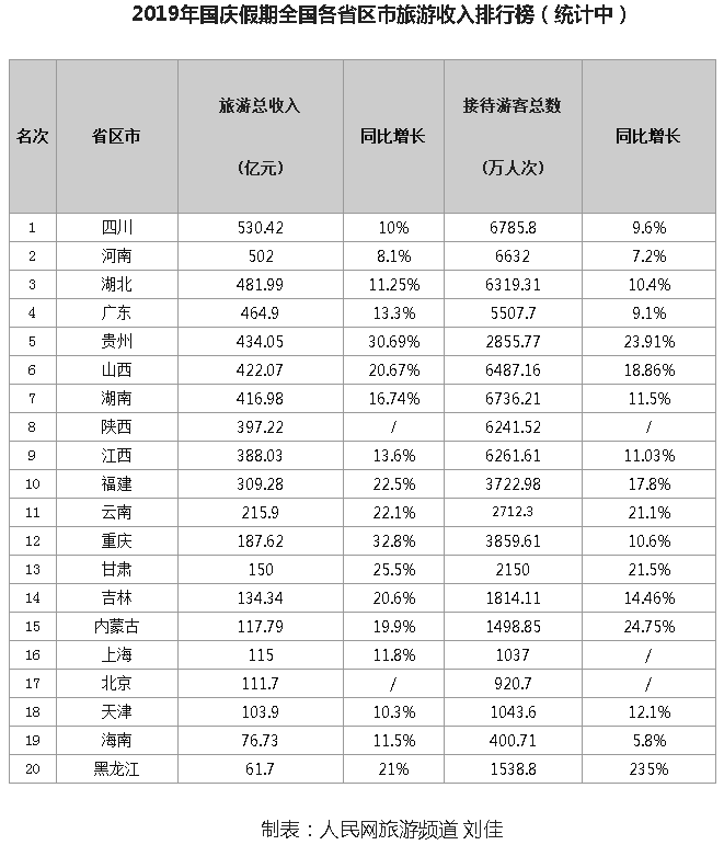 说明:本表采用的是各省区市文化和旅游厅公开统计数据,各省市区统计涵盖范围或有不一,若有出入请及时与人民网旅游频道联系。联系电话:010-65363629。