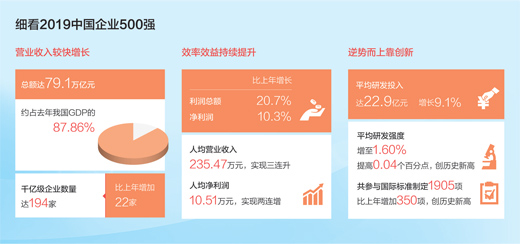 企业是社会主义市场经济的微观主体,是国民经济基础细胞,是推动经济社会发展的主体力量。过去一年,面对贸易保护主义、单边主义抬头,以及国内经济结构调整与新旧动能转换的挑战,中国企业500强依然交出了亮眼成绩单。