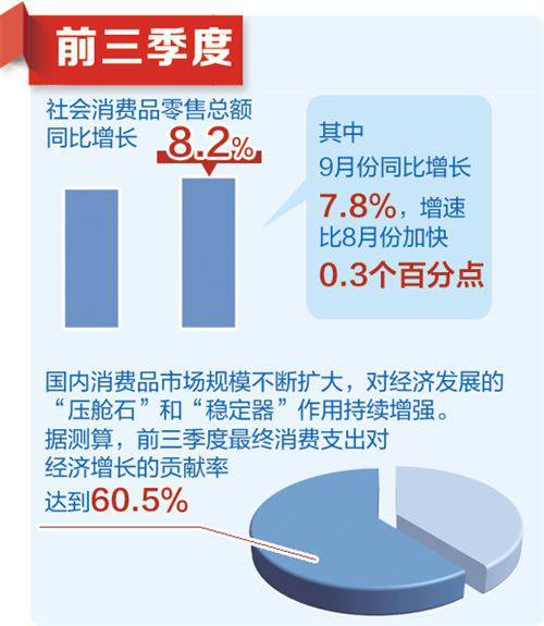 前三季度,社会消费品零售总额同比增长8.2%。其中,9月份同比增长7.8%,增速比8月份加快0.3个百分点;扣除价格因素,实际增长5.8%,加快0.2个百分点。