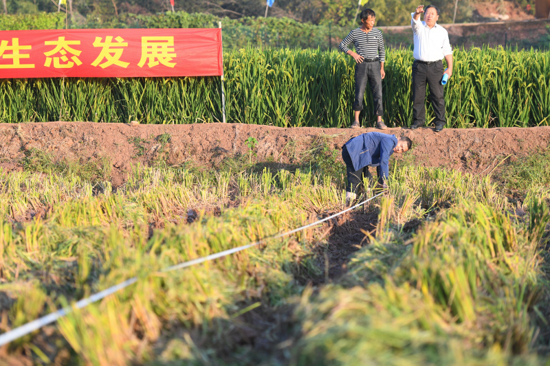 农业专家在第三代杂交水稻新组合试验示范衡南基地测产现场查看水稻生长情况(10月21日摄)。新华社记者 陈泽国 摄