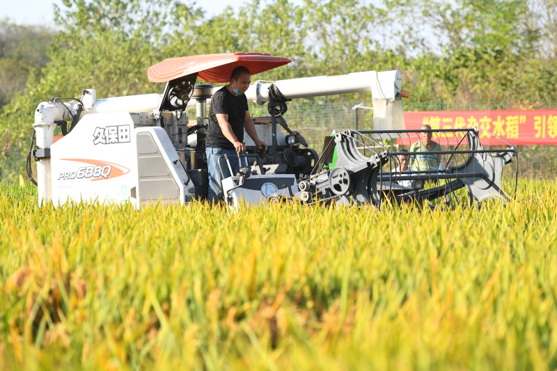 在第三代杂交水稻新组合试验示范衡南基地一块被抽取测产的示范田里,工作人员进行机械化收割测产(10月21日摄)。新华社记者 陈泽国 摄