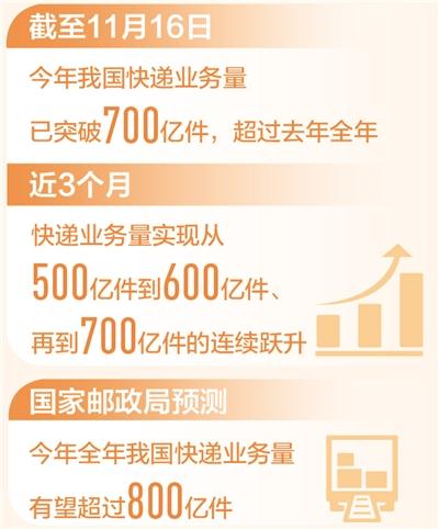 700亿件!国家邮政局监测数据显示:截至11月16日,今年我国快递业务量已超700亿件,超过去年全年。近3个月,快递业务量实现从500亿件到600亿件、再到700亿件的连续跃升。