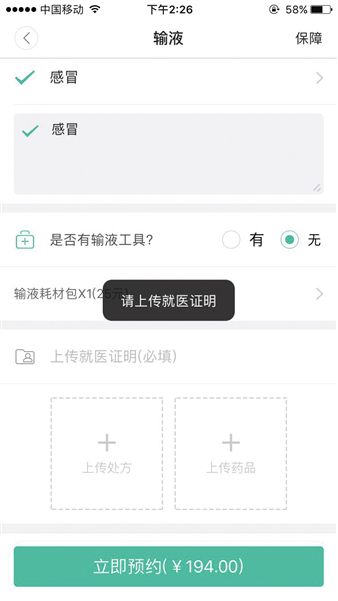 某“共享护士”平台要求预约时提供就医证明,但记者提供虚假资料也能通过审核。 手机截图