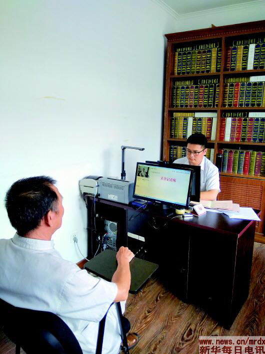 中华遗嘱库北京第一登记中心法务人员为老人登记遗嘱。