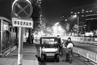 老年代步车进不了正规停车场,占道停车就成了普遍现象。前天晚上9点,记者在金融街一处高档写字楼下看到,一位年轻白领走出写字楼后,坐进了一辆白色四轮老年代步车,这辆车就赫然停在楼下人行步道上,车头车尾挂的蓝底车牌上写着“老年代步车”,车标竟然是奔驰。
